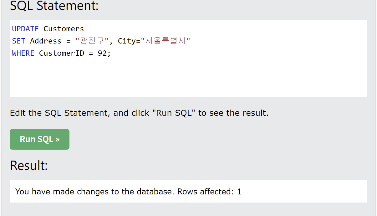 다시 Customer 테이블을 조회해보니, 내가 입력한 값으로 수정되어있는 것을 확인할 수 있었다.
